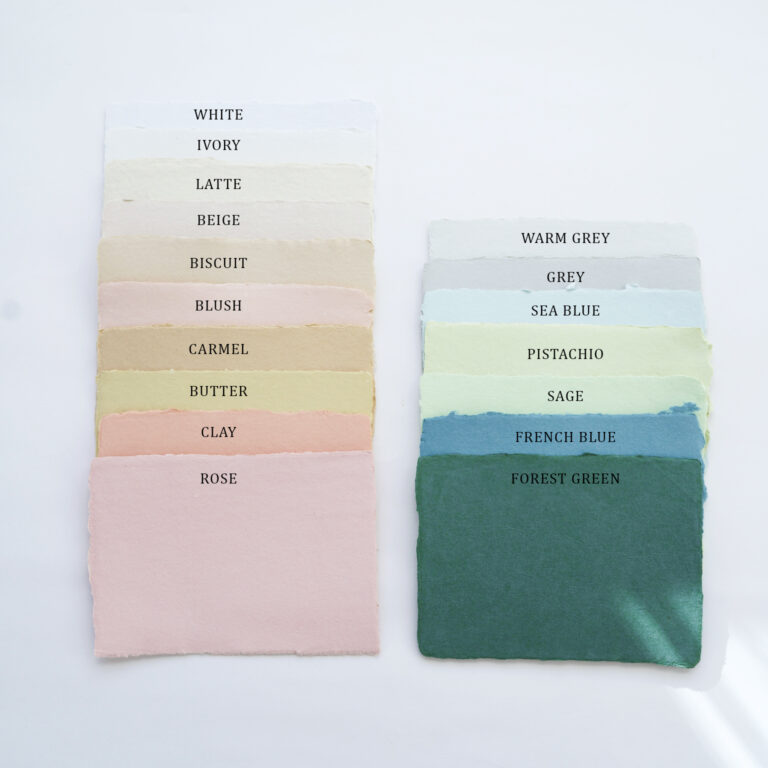 Zanurz się w subtelnych barwach natury, które możesz odkryć w naszej palecie papieru ręcznie czerpanego. Odkryj nasze pakiety próbek, które idealnie sprawdzą się podczas dobierania kolorów do dowolnych projektów.